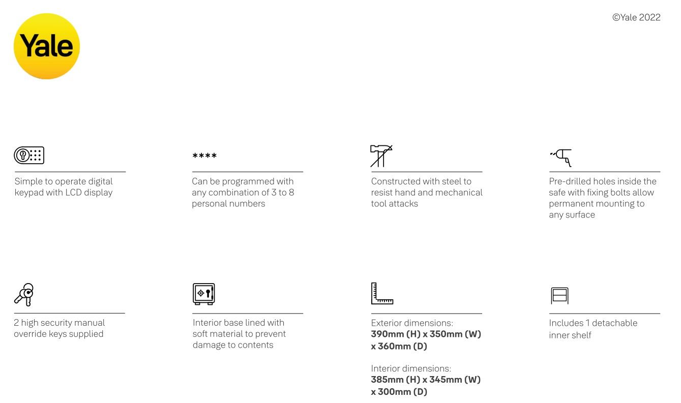 Bring the Yale 41 Litres Digital Safety Locker which helps in protecting the things that matter the most to you. Equipped with 41 litres capacity, it will keep your most important belongings secured. Designed with a strong steel body and 16 mm secure bolts and with a pin code, you are able to gain quick access to your safe. Also, the steel construction with carpeted floor helps to protect against scratches and damages. The Yale 41 Litres Digital Safety Locker nicely accommodates a wide range of items, including legal documents, passports, jewellery, cash, and more. Whether that’s your camera to capture those special moments or a sentimental belonging, this can be the ideal locker you are searching for. The Yale 41 Litres Digital Safety Locker is convenient to operate having a digital keypad with LCD display and a programmable combination of 3 to 8 digits. The electronic lock and digital pin access offer quick set-up and easy operation. Inputting the incorrect code 4 times sounds an internal alarm for 3 minutes and locks out the code pad for that time. It uses 4 AA size batteries (1.5 Volt). In case of battery failure, the safe can be operated with a manual override function with 2 security override keys supplied. It comes with pre-drilled holes (fixing bolts supplied) which allows permanent mounting to floors, walls, or most hard surfaces for additional security.